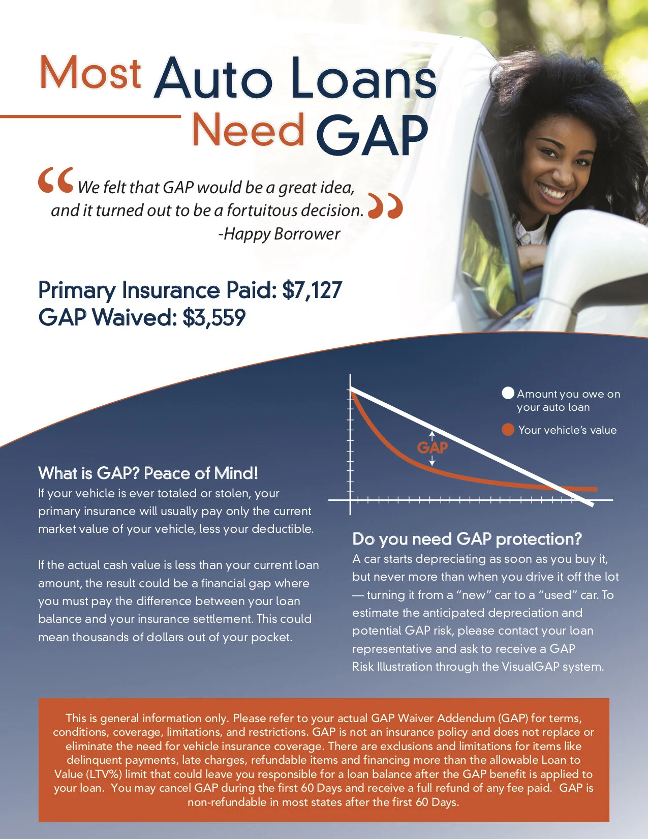 We offer Guaranteed Asset Protection or GAP Coverage on all vehicle financed with us. GAP is total loss protection and then some. The moment you drive your vehicle off the lot, it depreciates about 20% on average. And you can count on roughly a 15% decline in value each year for the next four years. GAP is designed to protect you when your car is deemed a total loss due to damage or theft and the value of that car is less than what you owe. You are responsible to pay the difference between what your insurance company says your car is worth and what you actually owe. GAP can help cover the difference and potentially save you thousands of dollars. Why pay $650 or more at a dealership for the same product that we offer for a low $399. Same coverage, half the price!